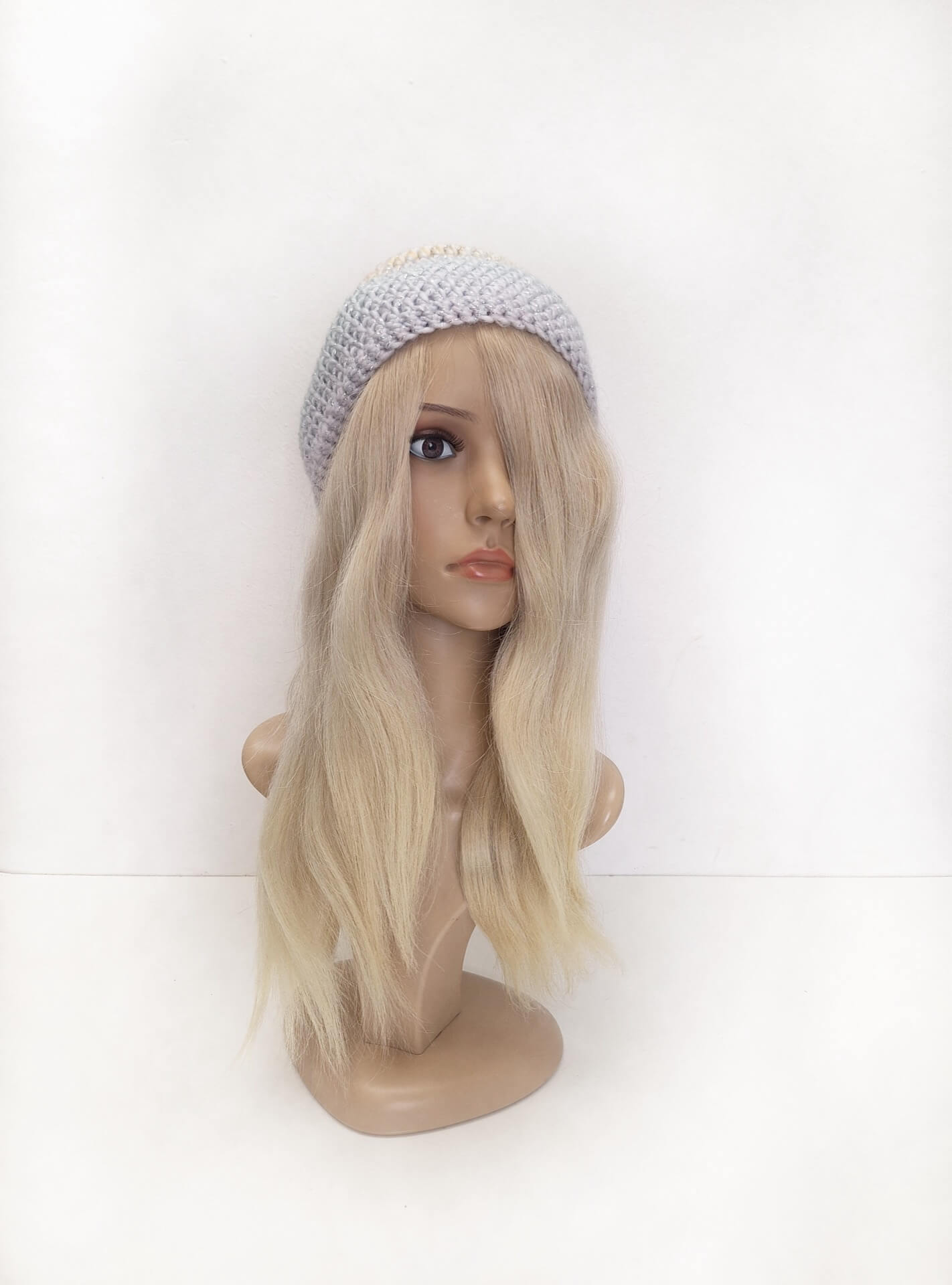 Hauptfarbe SB Superblond (gefärbt zu platinblond, Farbe changiert zu den Spitzen hin) Zweite Farbe SB Superblond 40 cm Haarlänge normales Haarvolumen Kopfumfang 53 cm